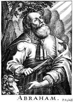 Description: Abraham holds a knife with the ram provided to take Isaac’s place as a sacrifice.