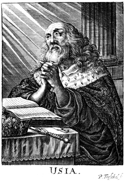Description: Uzziah, the King of Judah, shown in prayer with his crown and sword resting on the table with a book.