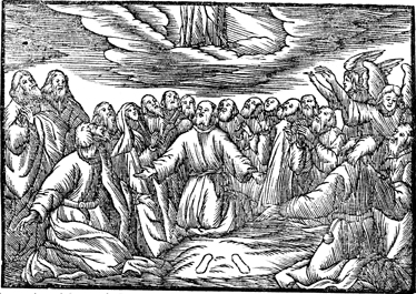 Description: Jesus ascends into heaven as a group of believers looks on.