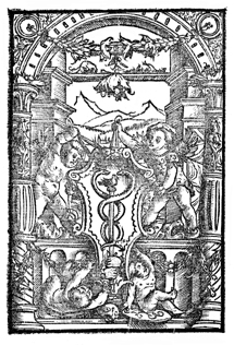 Description: Printer's device of Johann Froben (d. 1527), featuring the caduceus, displayed with the Swiss Alps in the background; designed by the Monogrammist C.B., who relied on the work of Ambrosius Holbein.
