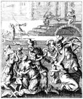 Description: Herod's soldiers kill all the male children two years of age and under in the vicinity of Bethlehem at Herod's decree. Engraved by John Sturt (1658–1730).