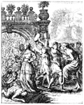 Description: Many enter through the wide gate with music and dancing as few enter through the narrow gate carrying crosses. Engraved by John Sturt (1658–1730).