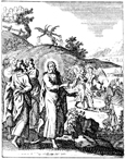 Description: Jesus tells the Parable of the Weeds as the action takes place in the background. Engraved by John Sturt (1658–1730).