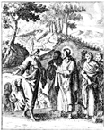 Description: Jesus teaches about the consequences of being led by the blind as the blind leads the blind into a pit in the background. Engraved by John Sturt (1658–1730).