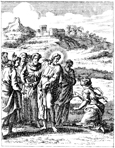 Description: The Canaanite woman asks Jesus to cast a demon from her daughter. Engraved by John Sturt (1658–1730).