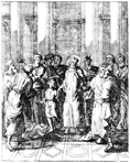 Description: Jesus teaches about greatness using a child as an example. Engraved by John Sturt (1658–1730).