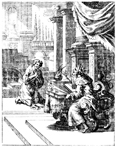 Description: The unmerciful servant is forgiven his debt by the king. Engraved by John Sturt (1658–1730).