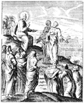 Description: Jesus teaches his disciples about the signs of the end starting with the fall of the temple, depicted in the background. Engraved by John Sturt (1658–1730).