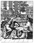 Description: A woman anoints Jesus' feet with perfume while he eats at the home of Simon the Leper in Bethany. Engraved by John Sturt (1658–1730).