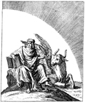 Description: St. Luke writes his gospel with his attribute, the bull, nearby. Engraved by John Sturt (1658–1730).