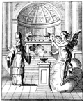 Description: The angel Gabriel visits Zechariah in the temple to tell him that he will have a son named John. Engraved by John Sturt (1658–1730).