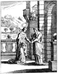 Description: Mary visits her cousin Elizabeth after finding out they are both pregnant. Engraved by John Sturt (1658–1730).