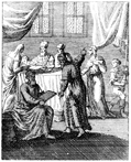 Description: John is circumcised, and his father Zechariah confirms that his name is to be John. Engraved by John Sturt (1658–1730).