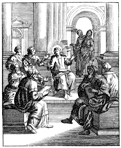 Description: Mary and Joseph find the twelve-year-old Jesus in the temple, sitting among the teachers, listening and asking questions. Engraved by John Sturt (1658–1730).