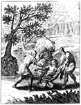 Description: A group of robbers beat and strip a traveler of this clothes. Engraved by John Sturt (1658–1730).