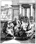 Description: Jesus heals a man with dropsy while eating dinner at a Pharisee's house on the Sabbath; outside, an ox is removed from a pit. Engraved by John Sturt (1658–1730).