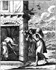 Description: A woman searches her house for a lost coin, while a shepherd brings a lost sheep home. Engraved by John Sturt (1658–1730).