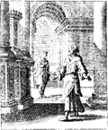 Description: A Pharisee and a tax collector pray in the temple. Engraved by John Sturt (1658–1730).