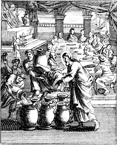 Description: Jesus changes water into wine at a wedding feast in Cana. Engraved by John Sturt (1658–1730).