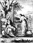 Description: Jesus converses with the Samaritan woman at the well in Sychar as the disciples return from buying food. Engraved by John Sturt (1658–1730).