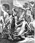 Description: Garments are placed at Saul's feet as Stephen is stoned. Engraved by John Sturt (1658–1730).