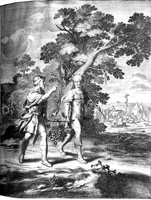 Description: Matthias Scheits' (c. 1630-1700) depiction of Joshua and Caleb returning from the land carrying a bundle of grapes, symbolic of the land's abundance (front); in the left back, Balaam strikes his donkey as an angel bars the way; in the right back those who look upon the bronze sbnake are saved from poisonous snakes.