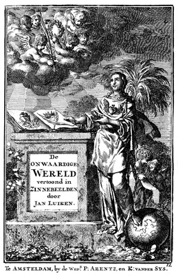 Description: A woman with an image of a heart with wings on her breast steps on the World; behind her are two angels and a palm-tree. She points to an open book that rests on a pedestal next to her, the pages of which show a burning heart and two crowned palm branches; above are six angels and cherubs, who offer the woman a wreath and a palm-branch. The pedestal carries the inscription: The Unworthy World, shown in emblems by Jan Luiken.