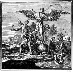 Description: The pious Spirit, with his feet still on the World, stretches his wings out in order to ascend as soon as Death, knelt next to him and following the direction of Time, has cut the last remaining tie. A man sinks in a pool at the right side, although he keeps clutching the World, and thereby catches the few drops of a liquid given to him by Vanity.