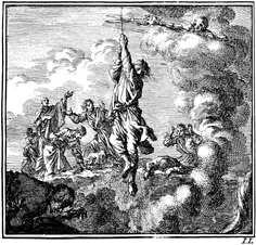 Description: Above the opening of a smoking volcano, a man hangs by a rope that is about to be cut by Death appearing in a cloud. A number of individuals watch the scene with signs of alarm. The Dutch artist and poet, Jan Luiken (1649-1712), whose initials are at the lower right, was responsible for drawing and etching this emblem and for the poem that accompanies it (below). The attendant scripture text is Matthew 10:28.
