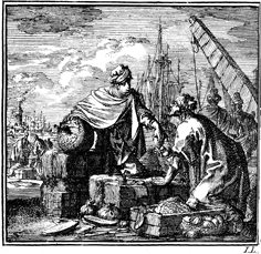 Description: On the quay of a busy harbor a merchant [Satan] is in the process of selling the World to a prospective buyer. The Dutch artist and poet Jan Luiken (1649-1712), whose initials are at the lower right, was responsible for drawing and etching this emblem and for the poem that accompanies it (below). The attendant scripture text is Isaiah 55:2.