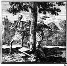 Description: Time keeps Death back from cutting a tree at the foot of which lies an ax. The Dutch artist and poet Jan Luiken (1649-1712), whose initials are at the lower right, was responsible for drawing and etching this emblem and for the poem that accompanies it (below). The attendant scripture text is Luke 3:9.