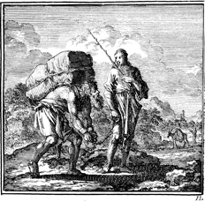 Description: An old man [Mankind], bent under the weight of a heavy load, is led with a chain by a young man [the Soul] who carries a whip. The Dutch artist and poet Jan Luiken (1649-1712), whose initials are at the lower right, was responsible for drawing and etching this emblem and for the poem that accompanies it (below). The attendant scripture text is Romans 6:17-18.