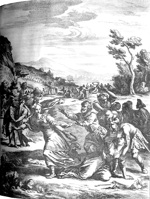 Description: Matthias Scheits' (c. 1630-1700) depiction of the Banjamites capturing girls from Shiloh, when they came to dance in the vineyards, and taking them for their wives.