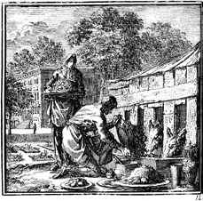 Description: Two persons bring a number of platters with sumptuous food which they dump in the trough of the pigsty [Flesh and Blood]. On the background left a large family [the Soul] house. The Dutch artist and poet Jan Luiken (1649-1712), whose initials are at the lower right, was responsible for drawing and etching this emblem and for the poem that accompanies it (below). The attendant scripture text is John 6:27.