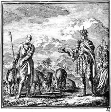 Description: A king offers a crown to a swine herder who refuses it, because a piece of his torn cloak is demanded in return. The Dutch artist and poet Jan Luiken (1649-1712), whose initials are at the lower right, was responsible for drawing and etching this emblem and for the poem that accompanies it (below). The attendant scripture text is Isaiah 65:2.