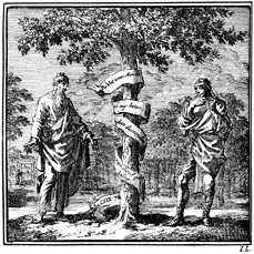 Description: In an orchard, an old and a young man stand at opposite sides of a tree with a ribbon wound around its trunk that is inscribed: The Law of your Mouth is more precious to me than thousands of pieces of Gold and Silver (Psalm 119:72). In the background a man chooses between a wide and a narrow gate. The Dutch artist and poet Jan Luiken (1649-1712), whose initials are at the lower right, was responsible for drawing and etching this emblem and for the poem that accompanies it (below). The attendant scripture text is Luke 6:38.