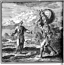Description: A man, who carries the World on his shoulders with great effort, is spoken to by another man, who proceeds without impediment. The Dutch artist and poet Jan Luiken (1649-1712), whose initials are at the lower right, was responsible for drawing and etching this emblem and for the poem that accompanies it (below). The attendant scripture text is Mark 4:18-19.
