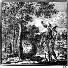 Description: Two men are standing next to a tree at the foot of which lays the World, in the form of a globe with a cross on top, and compare the few fruits [pious Souls] to the numerous leaves [Souls]. The Dutch artist and poet Jan Luiken (1649-1712), whose initials are at the lower right, was responsible for drawing and etching this emblem and for the poem that accompanies it (below). The attendant scripture text is Matthew 13:30.