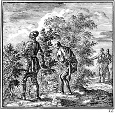 Description: Two men, one is clad in armor [cloak of Virtue] and the other is scantly clothed, try to penetrate a thorn bush. The Dutch artist and poet Jan Luiken (1649-1712), whose initials are at the lower right, was responsible for drawing and etching this emblem and for the poem that accompanies it (below). The attendant scripture text is Proverbs 12:21.