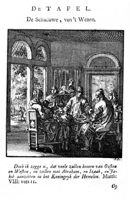 Description: A family is seated around a bountiful table. A woman clasps her hands in prayer as the reader is invited by this peaceful scene and by the citation of Matthew 8:11 to remember the words of Jesus about the kingdom of heaven and all those who come from the east and the west to gather at the banquet with Abraham. The Dutch artist and poet Jan Luiken (1649–1712) whose initials are at the lower right, was responsible for drawing and etching this emblem and wrote the accompanying poem.
