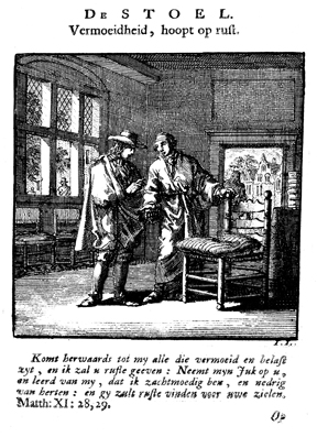 Description: Just as a good host will offer a comfortable chair to his weary guest, so Jesus offers heavenly rest to the weary soul (Matthew 11:28-29). The Dutch artist and poet Jan Luiken (1649–1712), whose initials are at the lower right, was responsible for drawing and etching this emblem and wrote the accompanying poem.