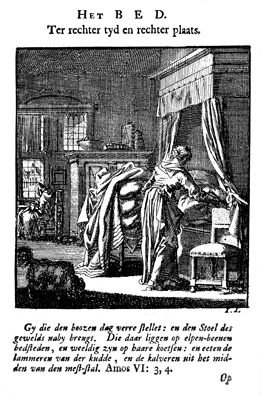 Description: By this comfortable home with a maid making a luxurious bed, the reader is called to remember Amos’ stern warning of God’s judgment on those whose lives are devoted to their own comfort (Amos 6:3-4). The Dutch artist and poet Jan Luiken (1649–1712), whose initials are at the lower right, was responsible for drawing and etching this emblem and wrote the accompanying poem.