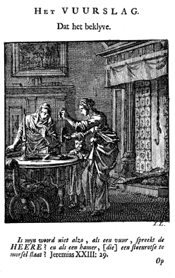 Description: The ordinary, domestic lighter or tinderbox reminds the spiritual person that God’s word is powerful and like a fire (Jeremiah 23:29). The poem urges the reader to acquire God’s light now, while the hand of God still makes the heart beat. The Dutch artist and poet Jan Luiken (1649–1712), whose initials are at the lower right, was responsible for drawing and etching this emblem and wrote the accompanying poem.