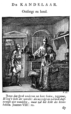 Description: The simple candlestick and its usefulness in dispelling darkness in the home reminds the attentive that Jesus is the light of the world and brings light and understanding to all who follow him (John 8:12). The Dutch artist and poet Jan Luiken (1649–1712), whose initials are at the lower right, was responsible for drawing and etching this emblem and wrote the accompanying poem.