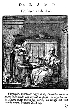Description: The man who is stingy with lamp oil—saving the oil to dispel future darkness—sits in the darkness. Similarly, many refuse to give themselves over to the light of eternal life in their efforts to preserve their earthly lives (John 12:24; Mark 8:35). The Dutch artist and poet Jan Luiken (1649–1712), whose initials are at the lower right, was responsible for drawing and etching this emblem and wrote the accompanying poem.