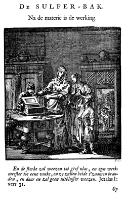 Description: While a young boy puts bundles of dry twigs on a table near a bin containing sulfur, his mistress admonishes him to be careful not to start a fire. The poem nearby elaborates: Just as fire and sulfur result in a quick flame, so do the sins of the land, when they reach God’s fiery wrath (Isaiah 1:31). The Dutch artist and poet Jan Luiken (1649–1712), whose initials are at the lower right, was responsible for drawing and etching this emblem and wrote the accompanying poem.