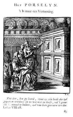 Description: Just as this woman proudly shows her visitor the beautiful porcelain plates displayed along the walls of her home, dishes for show but not for serving food, so many devote their lives to ostentatious display rather than to the cultivation of virtue. According to the attendant scripture (Luke 8:18), such lives are empty and vain and elicit the judgment of God. The Dutch artist and poet Jan Luiken (1649–1712), whose initials are at the lower right, was responsible for drawing and etching this emblem and wrote the accompanying poem.