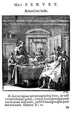 Description: As the family gathers for dinner, care is given to cover one’s garments with napkins to prevent soiling. A nearby poem expresses a wish that people were so attentive to the care of their souls and avoid staining them through sin (Hebrews 10:22). The Dutch artist and poet Jan Luiken (1649–1712), whose initials are at the lower right, was responsible for drawing and etching this emblem and wrote the accompanying poem.