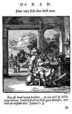 Description: A workman at his bench is careful to set down the jug so that it does not topple over, but people can be so careless in matters of the soul and conscience (Isaiah 1:3). The Dutch artist and poet Jan Luiken (1649–1712), whose initials are at the lower right, was responsible for drawing and etching this emblem and wrote the accompanying poem.