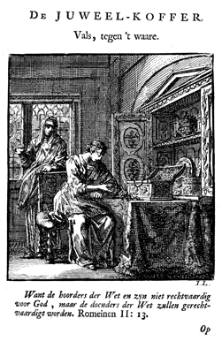 Description: As one woman admires the beautiful things in a jewelry chest, another admonishes her that such things pale in comparison with the treasures from the mouth of Christ. Those who obey God will be declared righteous at the end (Romans 2:13). The Dutch artist and poet Jan Luiken (1649–1712), whose initials are at the lower right, was responsible for drawing and etching this emblem and wrote the accompanying poem.